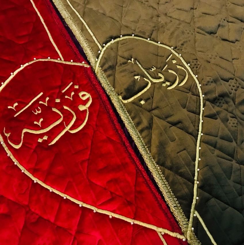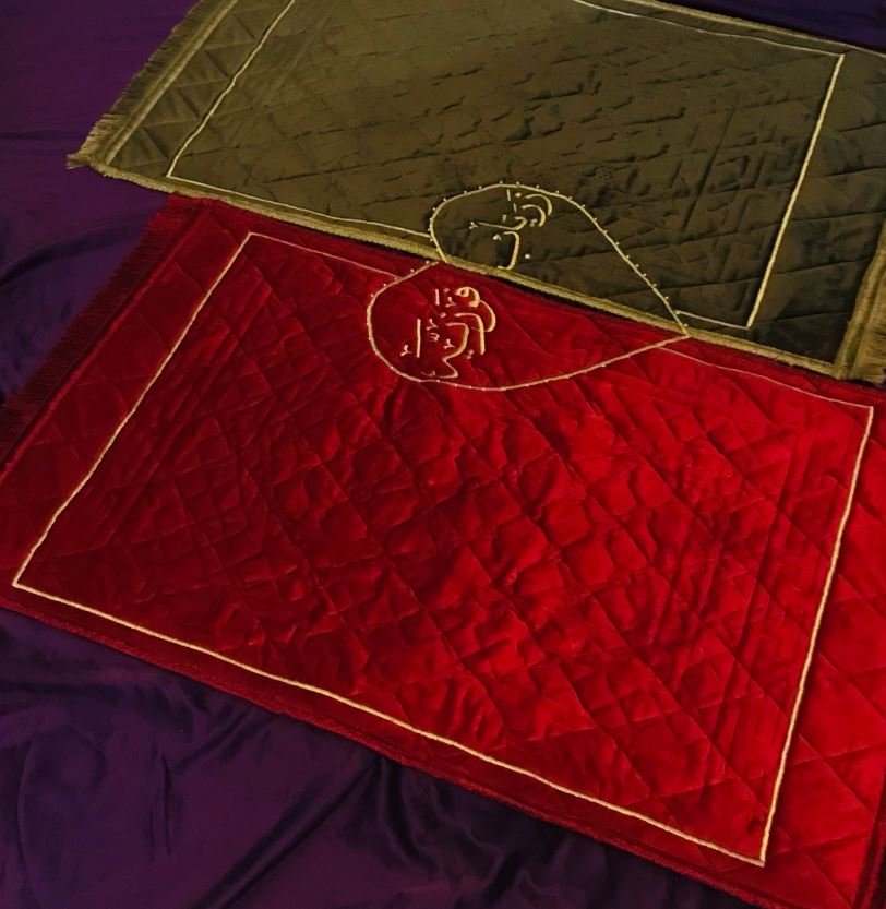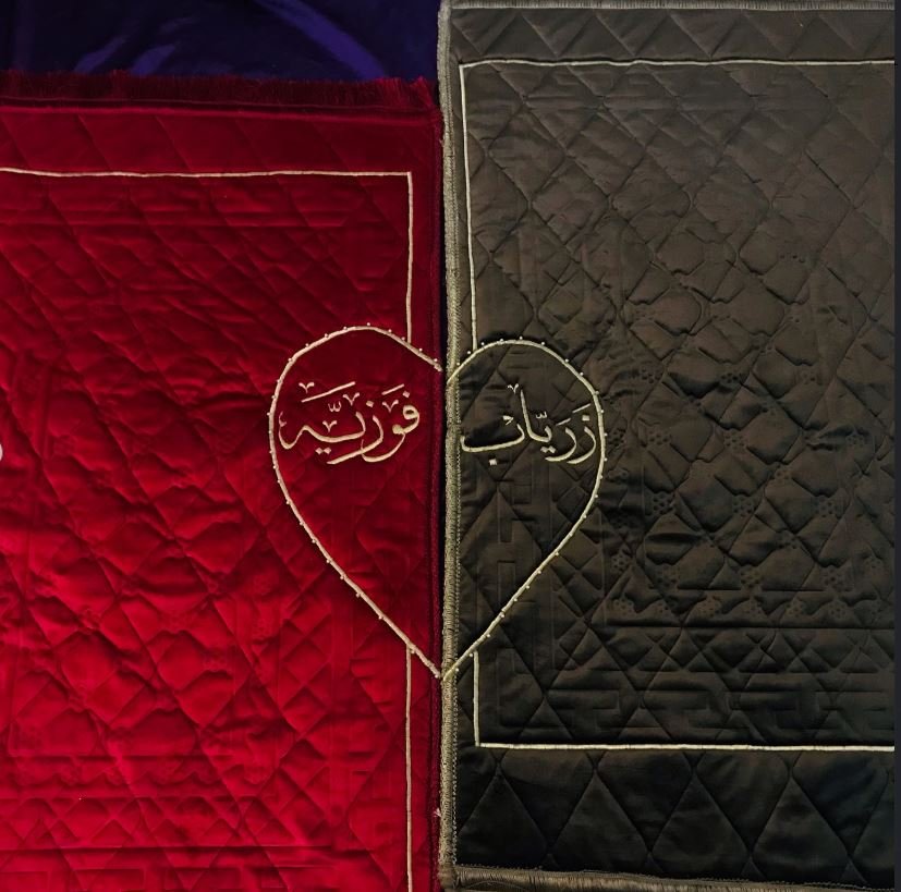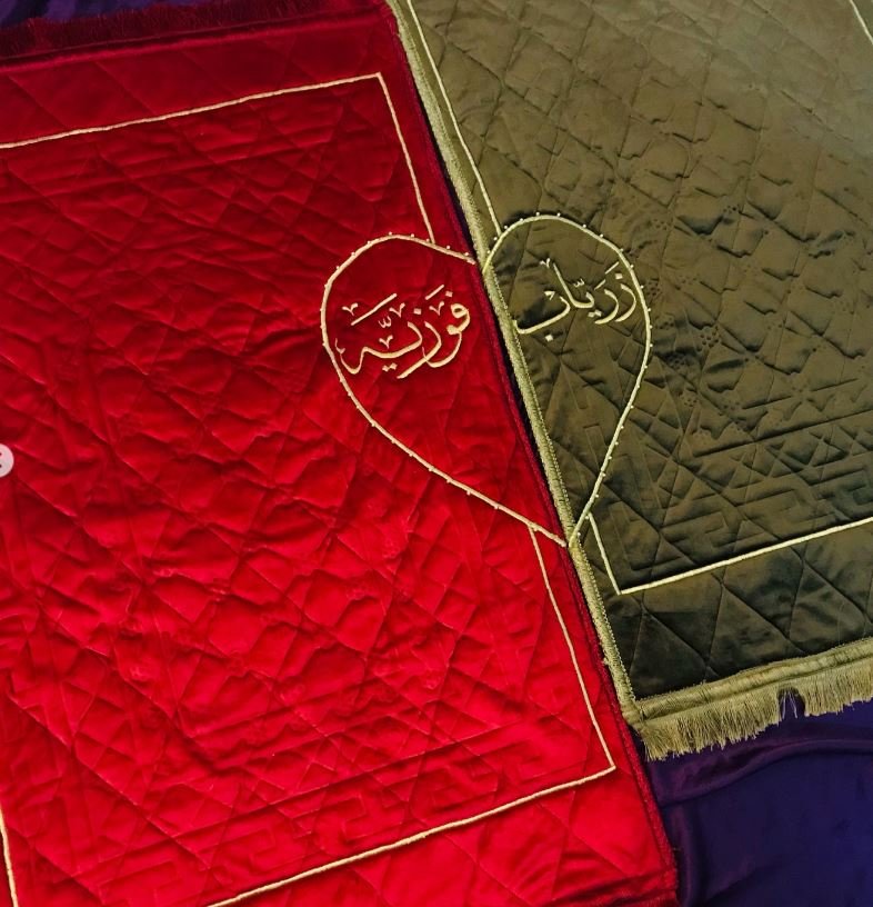 Here is the couple prayer mat with customers name and heart for all the Muslim couples out there. It has foam padding inside it and you can fold it easily after offering the prayers. The beads on this cute couple name praying Matt are complimentary so if you do not want to and then you can skip them.