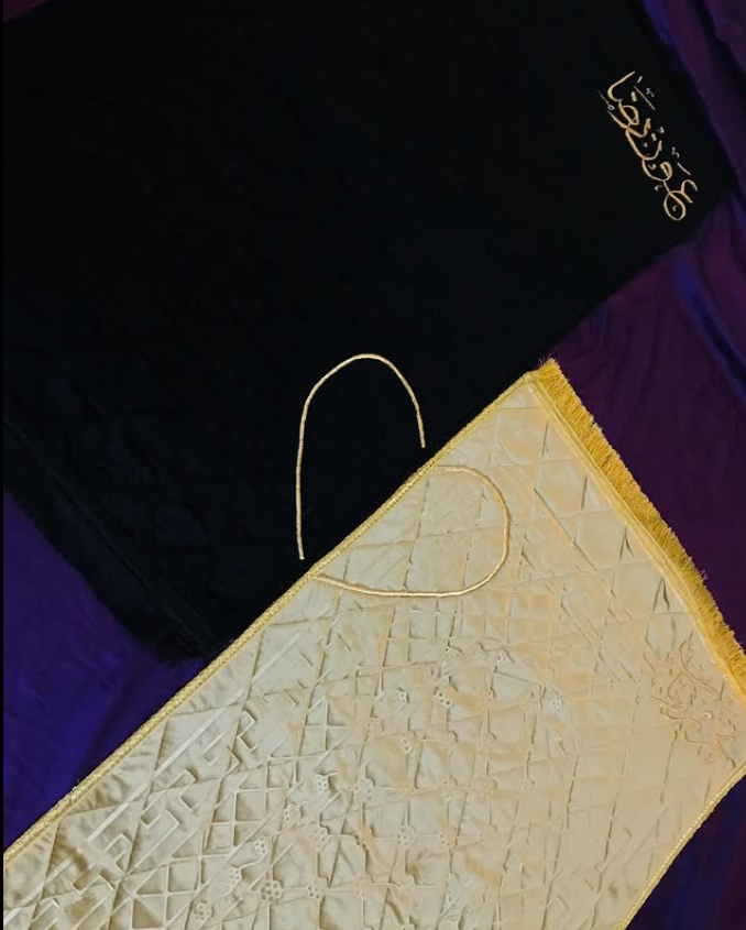 Each set includes two beautifully coordinated mats with a heart-inspired motif, symbolizing unity, faith, and shared devotion. Crafted with soft velvet or silk-textured fabric, they make a perfect Nikah, wedding, or anniversary gift.